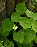 Soft shrubby perennial, often with straggling stems, up to c. 1 m tall. Leaves ovate-pentagonal in outline, up to 8 × 7 cm, angled to shallowly 3-5 lobed, stellate pubescent on both surfaces, usually more densely and paler below, deeply cordate at the base, basal lobes often overlapping; margin crenate-serrate. Flowers creamy-white to deep orange-yellow, sometimes with a purple-red centre. Epicalyx of 5(6) widely spreading bracts, 7-11 mm long, ovate to oblong-lanceolate, 5-veined, stellate-pubescent, green at flowering time, turning brown and dry in fruit. |