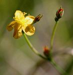 Erect perennial herb, occasionally annual, up to 70 cm tall, occurring in wet grassland and swampy places. Stems quadrangular without dark glands. Leaves lanceolate, sessile, clasping around the lower stems, margin recurved. Flowers terminal, solitary or in lax heads, yellow to pale orange with red markings, the petals rolling up in the heat of the day. Fruit a small capsule. |