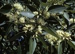 Tree. Bark smooth, white or glaucous. Leaves narrowly lanceolate, attenuate-acuminate. Umbels axillary, 3-10-flowered; peduncles c.1-1.2 cm, flattened; pedicels scarcely differentiated from the receptacle-tube. Operculum conical, shorter than broad. Fruit 7-8 mm, glaucous; valves 4-6, clearly visible at the mouth. |