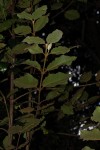Medium-sized tree. Bark dark and fissured in square patches; young branches covered in dense rusty brown hairs. Leaves opposite, ovate to broadly elliptic, up to c. 10 cm long, leathery, shiny dark green above, light green and covered in woolly hairs below; veining conspicuous below, covered in dense rusty brown hairs; apex sharply pointed; margin strongly toothed. Flowers small and inconspicuous in branched terminal heads, up to 12 cm long, cream, covered in soft, light grey hairs. Fruit subspherical, fleshy, c. 10 mm in diameter, white, turning red when ripe, crowned with the calyx remains. |
