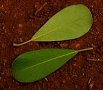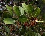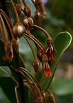 Usually a shrub or a much-branched small tree. Leaves somewhat crowded at the ends of branches, obovate-oblong, up to 8.5 cm long, thickly leathery dark green with a yellowish midrib, paler green below; margin entire. Flowers in many-flowered axillary clusters near the ends of the branches, pendulous on long stalks, c. 2.5 cm long greenish-white. Fruit a berry, green turning yellow to orange when ripe, pointed at the apex with the persistent style, edible. |