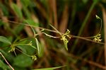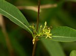 Erect small shrub, up to c. 1 m high with usually rather long, slender, often reddish-brown branches. Milky sap present. Leaves opposite, ascending, elliptic-oblong or lanceolate, 2.5-5 cm long, dark green above, much paler beneath, hairless; petiole 1.2-2.5 cm long. Flowers in subaxillary, subsessile, 3-15-flowered, branched clusters; sepals oblong, minutely ciliate at the apex. Corolla campanulate, yellowish-green, hairless; corona-lobes inserted at the middle of the corolla-tube. Follicles diverging at an angle of about 80°, 7.5-11 cm long, narrowly fusiform, gradually tapering from about the middle to a subacute point, hairless. |