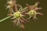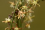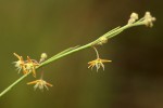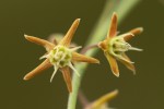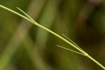 Slender, erect perennial herb with annual unbranched stems up to 60 cm tall. Milky latex present. Leaves opposite, very narrowly linear, 1.6-5 cm long. Flowers axillary, 1-4 per node, whitish or yellowish-green with corolla lobes tinged brownish to purple, spreading c. 4 mm long, hairless. Corona with square-shouldered basal lobes and along and narrow. erect apical appendage. Fruit often developed c. 4 cm long, pubescent. |