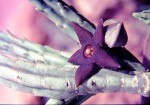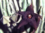 Compact, erect, clump-forming succulent perennial, up to 15 cm. Stems 4-angled or 4-ribbed, tapering at the apex, more or less erect, pubescent, grey-green with tuberculate teeth along the angles. Leaves up to 7 mm, pubescent, narrowly acute with conspicuous pale stipular glands. Flowers subsessile, facing outwards along the stems. Corolla wheel-shaped, or with lobes somewhat reflexed, 15-35 mm in diameter, variably pubescent on the outside and on the apical part of the lobes, otherwise mostly hairless. Lobes ovate-acuminate, convex to slightly reflexed, wrinkled transversely, yellow-brown to dark brown, sometimes tinged greenish. Corona raised inside the shallowly cup-shaped centre of the flower; outer lobes oblong; inner lobes shorter than the anthers. |