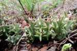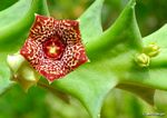 Dwarf succulent perennial forming clumps 6-50 cm in diameter, connected by horizontal rhizomes. Stems 4-15 cm long, erect to spreading, grey-green, sometimes mottled with red or purple. Inflorescences up to 6 per stem, 1-3-flowered. Corolla 10-20 mm in diameter, yellow or maroon to pale brown or maroon with irregular cream markings; lobes broadly triangular, 3-5 mm long and 6-8 mm broad at the base. Corona 3-4 mm tall and 4 mm in diameter. |