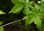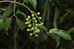 Often a strong liane, sometimes a scrambling shrub or rarely a small tree. Bark grey-brown, fissured; young branches conspicuously 4-angled. Leaves mostly 5-foliolate. Leaflets elliptic to ovate-lanceolate narrowing to a long point, green and somewhat scabrid above, paler and sparsely to densely hairy below, yellow oil-glands present on both surfaces, aromatic when crushed; margin usually entire; petiolule up to 2.5 cm for the central leaflet. Flowers in lax terminal heads, white, sometimes slightly tinged violet. Fruit round, c. 8 mm in diameter, fleshy, black, covered in a distinct orange-yellow papery layer. |