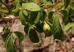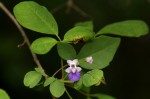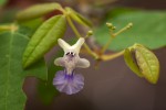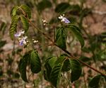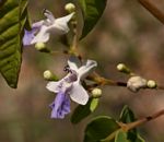 Multi-stemmed shrub or rarely a small tree. Bark grey fairly smooth; young branchlets velvety. Leaves opposite, 3-foliolate; leaflets broadly elliptic to ovate-lanceolate, up to c. 5 × 3 cm, central leaflet largest, thinly textured, often somewhat greyish-green with a whitish bloom, hairless above,sometimes sparsely hairy on the midrib below; margin often with a few teeth in the upper half; petiolules absent on the lateral leaflets, usually short but distinct on the central leaflet. Flowers in few-flowered, axillary heads, c. 1 cm long, white with a purple-blue lower lip. Fruit ellipsoid, c. 1.2 cm long, fleshy, black when ripe, cupped by the persistent calyx. |