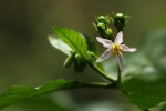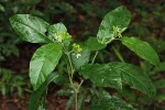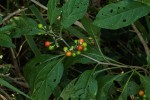 Unarmed perennial herb or small shrub, usually less than 2 m tall. Branches densely covered with small stellate hairs at first, gradually becoming hairless. Leaves lanceolate to obovate, 3–22.5 cm long, thinly textured with 5–9 pairs of lateral veins, whitish hairy when young but soon becoming sparsely hairy to quite hairless, gradually narrowing into the petiole and more or less unequal-sided at the base; margin somewhat undulate or entire, tending to dry blackish; petiole 0.5–4.5 cm long. Inflorescences leaf-opposed or leaf-remote, 1.5–3 cm long, 3–24-flowered; peduncle 0.1–1.8 cm long. Flowers (4)5-merous, more or less nodding; pedicels 5–11 mm long, slender, often densely hairy at first, becoming hairless except at the base, elongated to 16 mm in fruit, somewhat thickened towards the top, ascending or erect. Calyx 2–4(5) mm long; lobes somewhat unequal, ovate-triangular to triangular-elongate or broadly obovate, 0.5–3 mm long, enlarged in fruit enlarged to 5 mm long, more or less reflexed. Corolla bluish to pale violet, lilacineous or sometimes white 8–15 mm across; lobes linear-lanceolate or lanceolate, 3–8 mm long, more or less densely hairy outside mainly on the median part. Fruit globose, 6–10 mm in diameter, shining bright to deep red when ripe. |