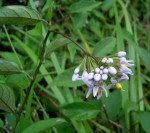 Creeper or climber to 3(-7) m. Leaves elliptic, 7(-11) × 3(-6) cm, sparsely pubescent to hairless; base rounded, decurrent on the petiole; apex acuminate; margin entire; petiole 1-2 cm. Flowers composed of 3-5 pedunculate umbels arranged in a dense terminal inflorescence. Pedicels 1-2 cm, thickened below the flower. Calyx lobes 5. Petals 7-10 mm, white, mauve, purple or blue; anthers yellow. Flowers 15-20 mm in diameter. Fruit 6-10 mm in diameter, spherical, red when ripe. |