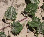 Prostrate perennial with annual creeping stems. Stems densely hairy. Leaves opposite, not lobed, very broadly ovate, up to 22 mm long; margin crenate-serrate. Flowers solitary, axillary, very pale to deep pink or mauve, usually with darker spots on the lower lip and in the throat. Fruit almost circular in outline c. 20 mm broad, densely covered in whitish hairs, with 2 erect spines on the raised upper surface. |