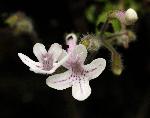 Perennial herb. All parts except flowers with long spreading hears. Leaves several in a loosely arranged tuft, linear-oblong to ovate, up to 10 × 4 cm; margin finely toothed or scalloped. Young leaves sessile, flowering leaf stalked with a pseudopetiole up to 35 mm long. Inflorescences 1 or 2 from the junction of the leaf base and the stalk, few-flowered. Flowers white with magenta-pink stripes and spots on the corolla lobes and in the throat. Capsule 8-15 mm long, densely covered in long spreading hairs, crowned by the persistent style. |