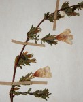 Perennial herb, prostrate, ascending or erect, sometimes shrubby with an unpleasant goat-like smell. Stems branched or unbranched, 1 m long or more, often sticky glandular, growing from a large woody rootstock. Leaves elliptic to obovate, 3-7 cm long, often sticky glandular, decurrent onto the stem at the base; margin entire or wit a single tooth each side. Flower solitary or 3 together in the leaf axils, usually crowded towards the ends of branches. Bracts leafy, 3-12 mm long, glandular. Calyx 10-21 mm long with strap-shaped lobes, sticky glandular. Corolla pale mauve to bluish-mauve, finely velvety outside, pleated part of the throat orange; tube brownish, 22-45 mm long; lobes ovate to oblong or obovate, 6-13 mm long. Capsule 10-19 mm long, finely velvety in the apical part. |