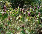 Perennial herb or subshrub, to 3 m tall according to FZ but typically much smaller in the flora area. Leaves opposite, petiolate, ovate, 2-20 cm long, green, without any colourful markings. Inflorescences of dense whorls, borne in the upper axils and at the stem apex. Calyx 4-lobed. Corolla white, pink, purple or red, with darker markings on the ‘upper’ lip. |