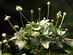 Multi-stemmed shrub, rarely a small tree. Leaves opposite or in whorls of 3, lanceolate or narrowly elliptic with about 6 pairs of distinct lateral veins, glabrous except for hairs on the mid-rib and veins below. Stipules with 3-5 apical bristles. Flowers in dense terminal heads, white to greenish-white, corolla tube with long yellowish hairs in the throat. Calyx conspicuous, asymmetrical, saucer-shaped. Fruit obconical, ribbed crowned by the enlarged calyx lobes. |