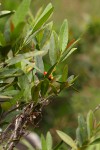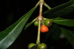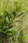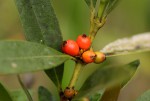 Evergreen shrub or small tree. Leaves opposite, elliptic to oblanceolate, up to 20 × 4 cm, leathery, olive-green, hairless, midrib and hairtuft domatia conspicuous below; margin entire, somewhat rolled under. Flowers in dense axillary clusters, waxy, white or creamy-pink, Fruit round, 6-10 mm in diameter, conspicuously crowned with the remains of the calyx, bright red when ripe. |
