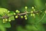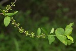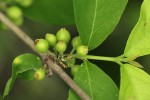 Somewhat scrambling shrub, rarely a small tree. Leaves opposite, variable in shape and size, mostly broadly elliptic to ovate, velvety hairy on the undersurface. Flowers bell-shaped in 1-5 flowered clusters, borne on distinct axillary stalks, appearing before or with the new leaves. Corolla white, often tinged pink with long, fluffy hairs in the throat. Fruit almost round, crowned with the remains of the calyx, hairy black when ripe. |