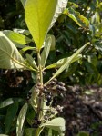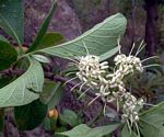 Shrub or small semi-deciduous tree. Leaves opposite or in whorls of 3, crowded towards the ends of branches, obovate with a rounded or emarginate apex; upper surface with rough hairs, lower surface greyish velvety, dotted with dark bacterial nodules. Flowers white, sweetly scented, in dense, rounded axillary heads. |