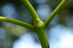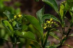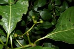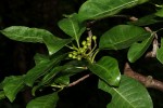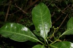 Shrub or small tree. Leaves elliptic to obovate, 10-20 cm long, stiff and leathery, glossy green, midrib and main lateral veins often distinctly paler; domatia present; stipuls simple triangular-ovate. Flowers in branched heads; corolla 4-5 mm in diameter, rich cream or yellow, densely hairy in the throat. Fruits in dense clusters, ovoid, c. 7 mm long, red to blackish when ripe. |