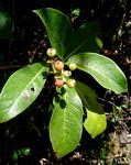 Small or tree. Bark grey, rather smooth, sometimes corky. Leaves elliptic to obovate, up to 23 cm long, leathery, hairless or with hairs mainly beneath; hairtuft domatia distinct; margin entire, often rolled under; stipules obovate, 2-lobed at the apex. Flowers in terminal branched heads, about 5 mm in diameter, creamy-white or greenish-yellow, bearded in the throat, sweetly scented. Fruit globose, 5-6mm in diameter, yellow to red when ripe, with two stones. |
