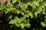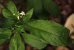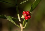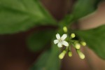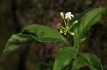 Mostly a smallish shrub up to c. 1-1.5 m tall but sometimes up to 3 m tall. Leaves opposite, elliptic, 2-14 cm long, mostly hairless but sometimes hairy on the veins; bacterial nodules mostly absent or rarely a few scattered around the leaf blade; stipules prominently bilobed. Inflorescences in few-many-flowered condensed subumbelliform heads, 1-1.5 cm in diameter on a peduncle up to 6.5 cm long. Flowers white. Fruit, subglobose, hairless, crowned by the limb of the calyx, first yellow to orange but bright red when ripe. |