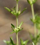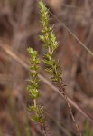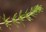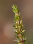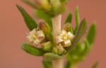 Herbaceous perennial with numerous unbranched stems, up to 30 cm long, growing from a rosette-like woody base. Leaves opposite to pseudo whorled, subsessile, 6-20 mm long, linear, to very narrowly (ob-)lanceolate, thinly textured, midrib often reddish-brown; margins papillate, sometimes rolled under. Stipular sheath with 1(-3) small setae. Flowers in clusters of 2-6 at the nodes, subsessile, greenish to yellowish, bisexual or unisexual on the same plant. Fruit reddish brown, shiny, hairless. |