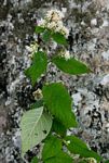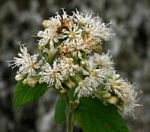 Lax branching shrub, up to c. 4 m tall but usually less than 2 m. Leaves ovate to elliptic, up to 17 × 8 cm, pubescent above, densely greyish-white velvety to woolly below, venation indented above, prominent below; margin coarsely toothed; petiole short. Capitula in branched terminal heads. Involucral bracts with whitish margins. Florets white, c. 7 mm long. |