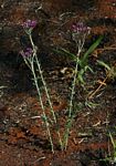 Erect, often tufted perennial herb, 30-80 cm. Stems 1-many, usually simple, occasionally branched, covered in greyish-white velvet. Leaves numerous along the stems, ovate to lanceolate or elliptic, up to c. 4 cm long greenish above, thinly velvety or almost hairless, densely silvery-grey velvety below, veining prominent; margin entire but wavy. Capitula in branched terminal heads, purple. |