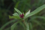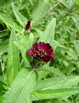 Erect, sparsely branched annual herb, up to 1.3 m tall Most parts covered in rough hairs. Leaves opposite, ± sessile; narrowly lanceolate, up to 20 × 5 cm, roughly hairy on both surfaces with longer hairs on the veins below; margin shallowly scalloped to almost entire. Capitula c. 2 cm in diameter, in the upper leaf axils. Ray florets dark purple to purple-brown, rarely pink. See white-flowered var. alba for comparison. |