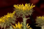 A slender perennial herb up to c. 140 cm tall, growing from a woody rootstock. Stems annual, 1 -several erect simple or more or less branched above. Leaves along the stem linear-oblong or lanceolate, mostly 3–12 cm long, decurrent on the stem in continuous wings; wings to 1.5 cm wide, sinuate-dentate to coarsely dentate on the margins, spinescent as in leaf upper surface. Leaves more or less crowded on the lower stem, sessile, oblanceolate, 12–22 cm long; margins of all leaves and stem wings sinuate-dentate to coarsely dentate or sub-entire, upper surfaces and margins beset with bristle-like spines 2–7 mm long. Capitula radiate, solitary and terminal, or several more or less clustered on stems and branches, 4–6 cm in diameter. Phyllaries mostly 12–20 mm long, the outer and innermost somewhat shorter, linear and spine-tipped; the outer phyllaries leaf-like and dentate-lobed with 2–4 bristle-like spines 3–5 mm long on each tooth, often also spinescent on the margin between the teeth; the inner phyllaries more or less unarmed. Rays yellow, mostly 15 mm long. Disk-floret corollas yellow, c. 7 mm long; achenes 1–2 mm long, more or less densely silvery strigose; pappus scales narrowly oblong-obovate, 1.5–2 mm long. |