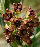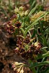 Perennial herb with 1-3 annual stems, growing from a slender vertical tuberous rootstock. Leaves opposite, shortly petiolate, lanceolate, up to 11 × 3.5 cm, pubescent on both surfaces; apex pointed, rounded or truncate at the base; margin with minute rough hairs. Inflorescences terminal and extra-axillary, 6-18-flowered spherical umbels. Corolla campanulate, reddish-purple, occasionally yellow, hairless or minutely papillate inside, pubescent outside. Lobes up to 12 × 8 mm, ovate-oblong to obovate, pointed and recurved at the apex. Corona lobes reddish-brown, flattened, spreading at the base, ascending to erect above, up to 13 × 4.5 mm, spathulate to obtriangular. Follicle erect on a twisted pedicel, up to 12 × 3 cm, lanceolate-fusiform with 6 longitudinal wings. |
