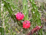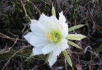 Spiny succulent shrub, 1-3 m high with branched, scrambling, often decumbent stems rooting at the nodes. Cladodes bright green, cylindrical, 20-40 mm in diameter, ribbed. Spines clustered with 1-2 central spines much longer than others. Leaves absent. Flowers showy, white 15-20 cm long, opening at night. Fruit spherical, pinkish-red outside, white inside with black seeds. |